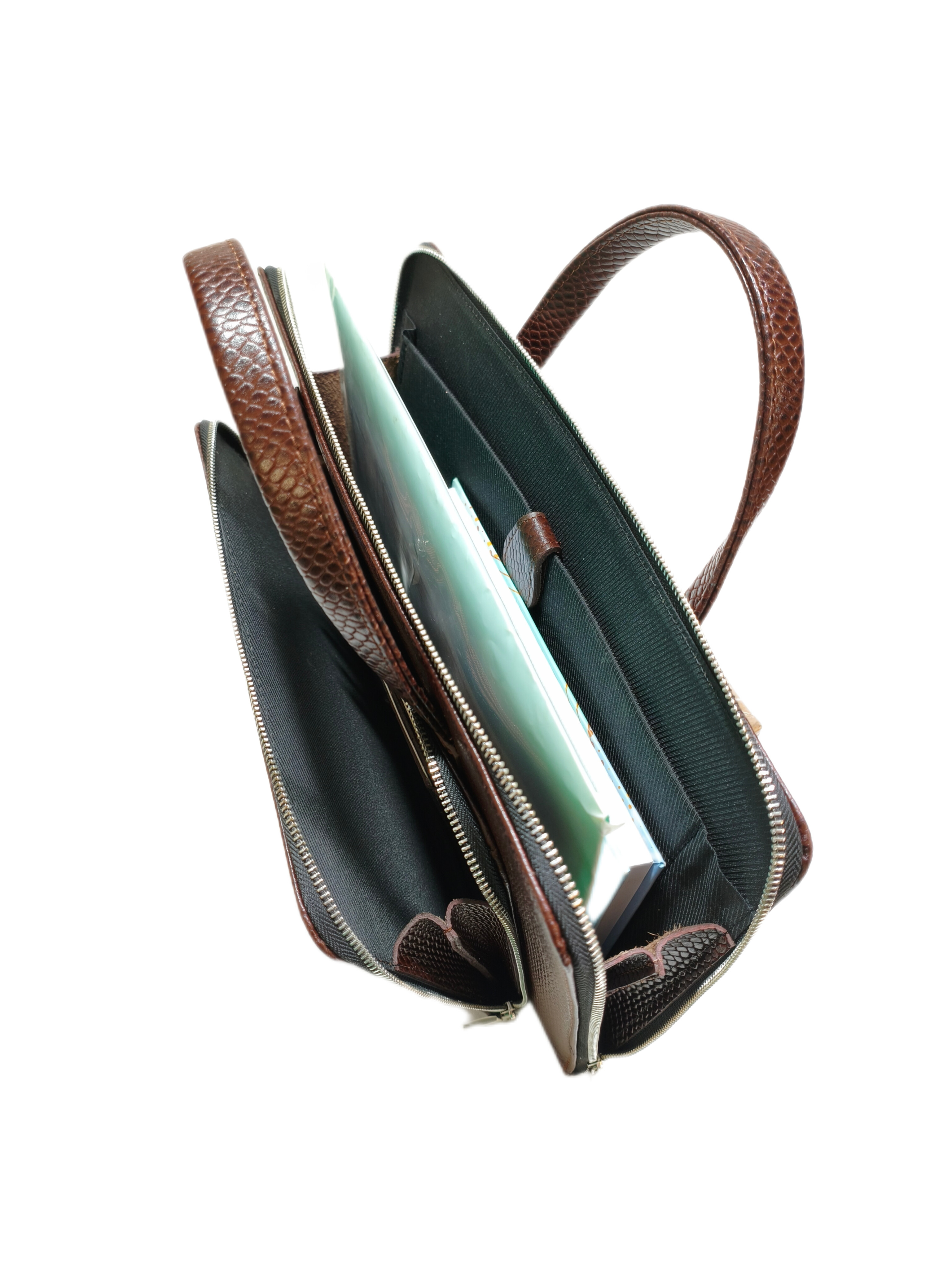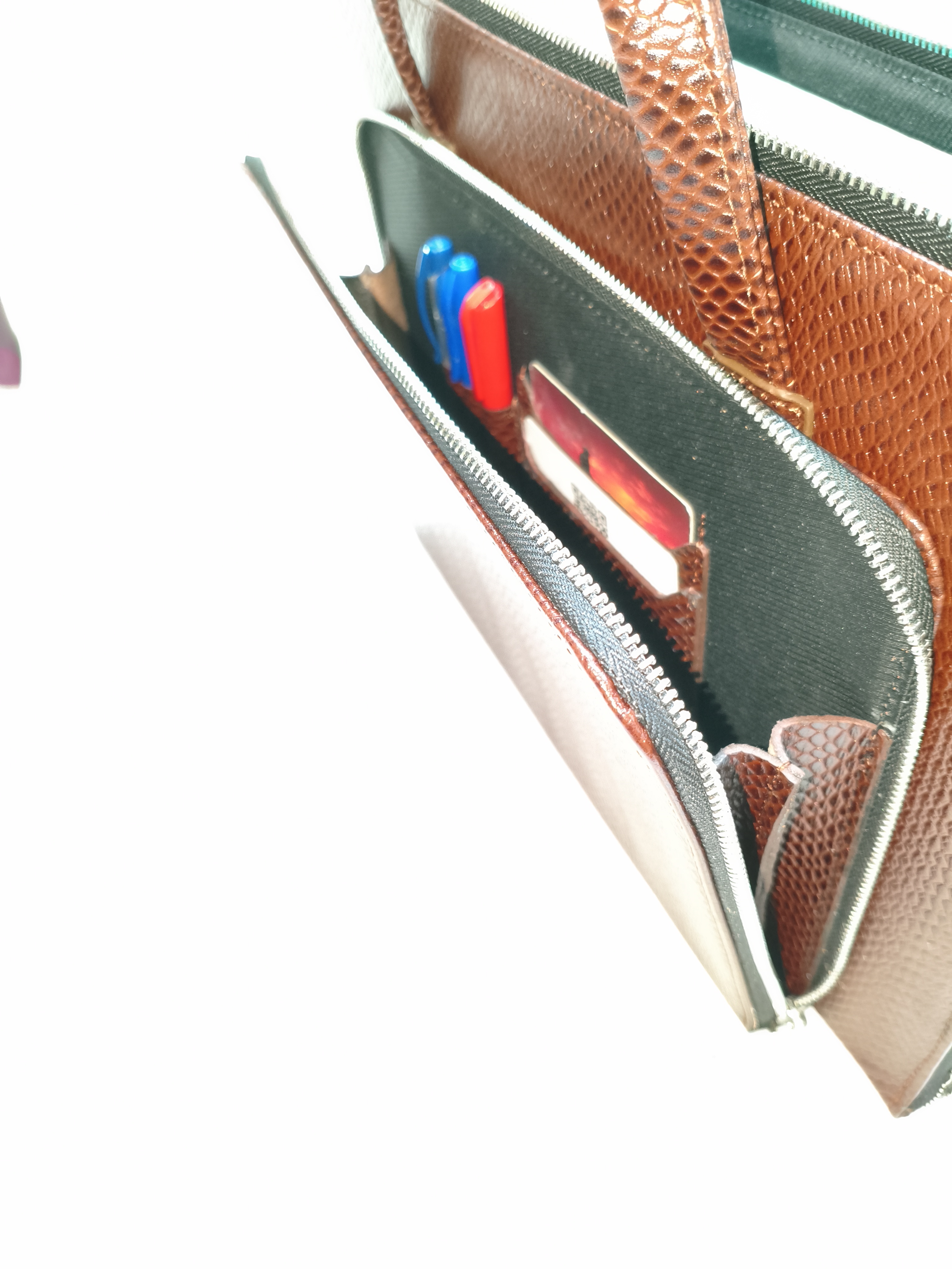 کیف کلاسور دسته دار ساخته شده از چرم گاوی درجه یک چاپ پوست ماری قهوهای کار بسیار باریک در عین حال بسیار جادار دارای محفظه لب تاب ،جای کارت و جا خودکار داخل کار هم یک زیپ کار شده بسیار سبک برای استفاده روزمره یک انتخاب ایده آل برای شما.